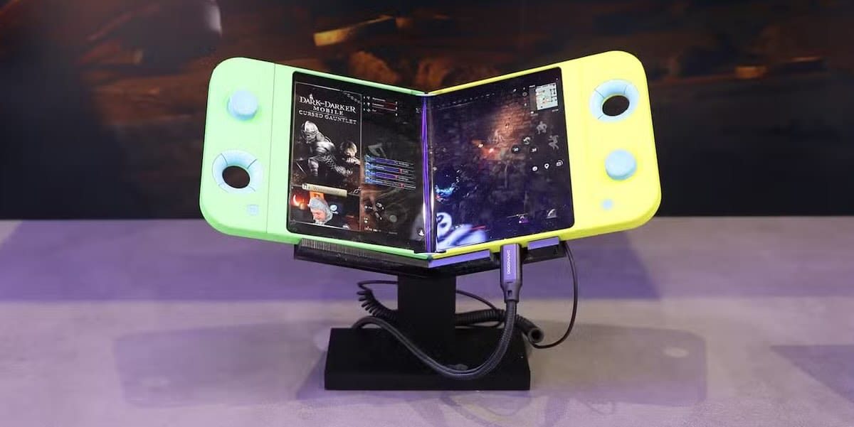 The flex gaming console features joysticks and d-pads on both sides of the display, with a unique cavity design to accommodate the joysticks when folded. It also includes a home button, a button marked with an ‘n’, and a USB Type-C port at the bottom. The lime-like green-yellow color (of the current prototype) adds a vibrant, futuristic touch to the device.